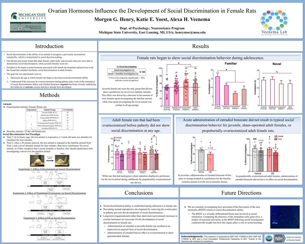 Through prepubertal ovariectomies and acute administration of estradiol benzoate, we found that long-term increases in ovarian hormones have organizational effects that are necessary for the development of social discrimination abilitie